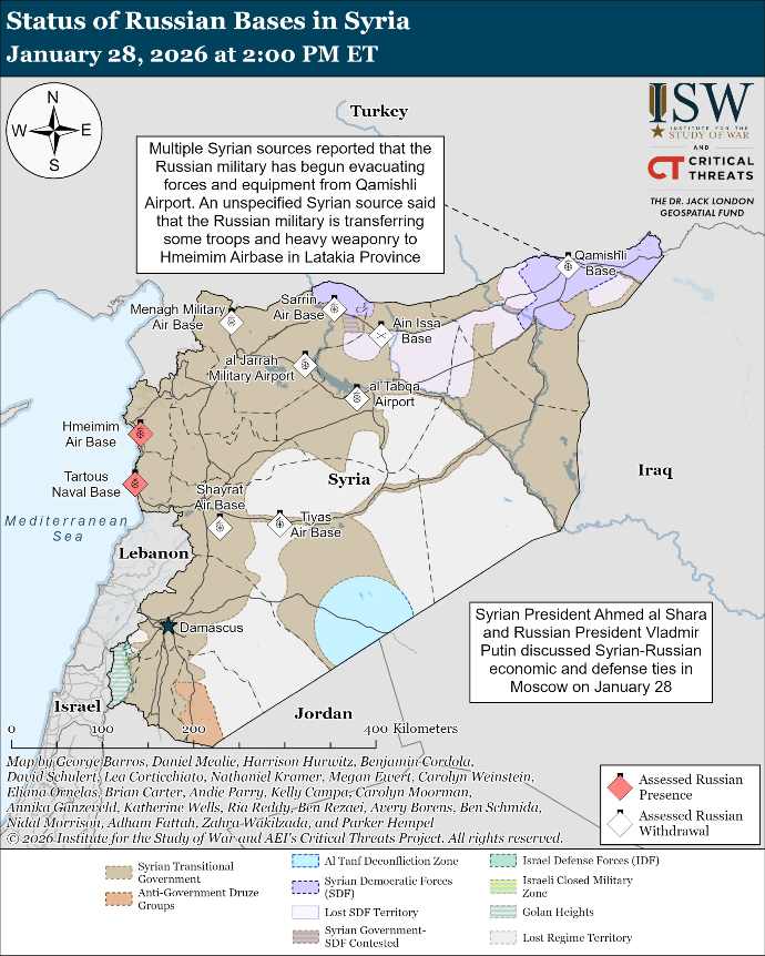 Hozirgi bosqichda yangi hukumat Suriya hududining taxminan 70 foizini nazorat qilmoqda, biroq mamlakatning g‘arbiy qismidagi alavitlar va janubidagi druziylar kabi mahalliy jamoalar bilan bog‘liq xavfsizlik muammolari saqlanib qolmoqda. Ushbu beqarorlik sharoitida, 2025-yil oktabr oyida Moskvaga tashrif buyurgan Ahmad al-Sharaa Vladimir Putindan Rossiyaning Suriyadagi Tartus dengiz harbiy bazasi va Latakiyadagi Khmeimim havo bazasini saqlab qolishni so‘ragan. Ushbu yondashuv Damashq uchun janubda Isroil, shimolda esa Turkiya ta’sirini muvozanatlashga qaratilgan tashqi siyosiy strategiyaning bir qismi sifatida baholanadi.